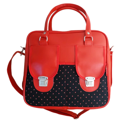 Bolso de cuero sintético color rojo. Interior forrado con forro anti roturas. Dos Bolsillos frontales con Cerraduras en telas estampadas, acceso superior y bolsillo interno, además posee correa desmontable para usar como morral (opcional) Este y todos nuestros productos son hechos a mano, de industria nacional